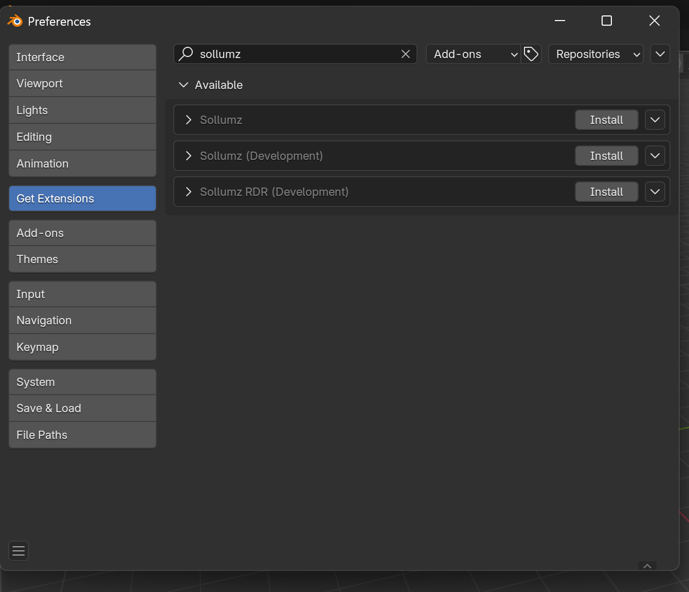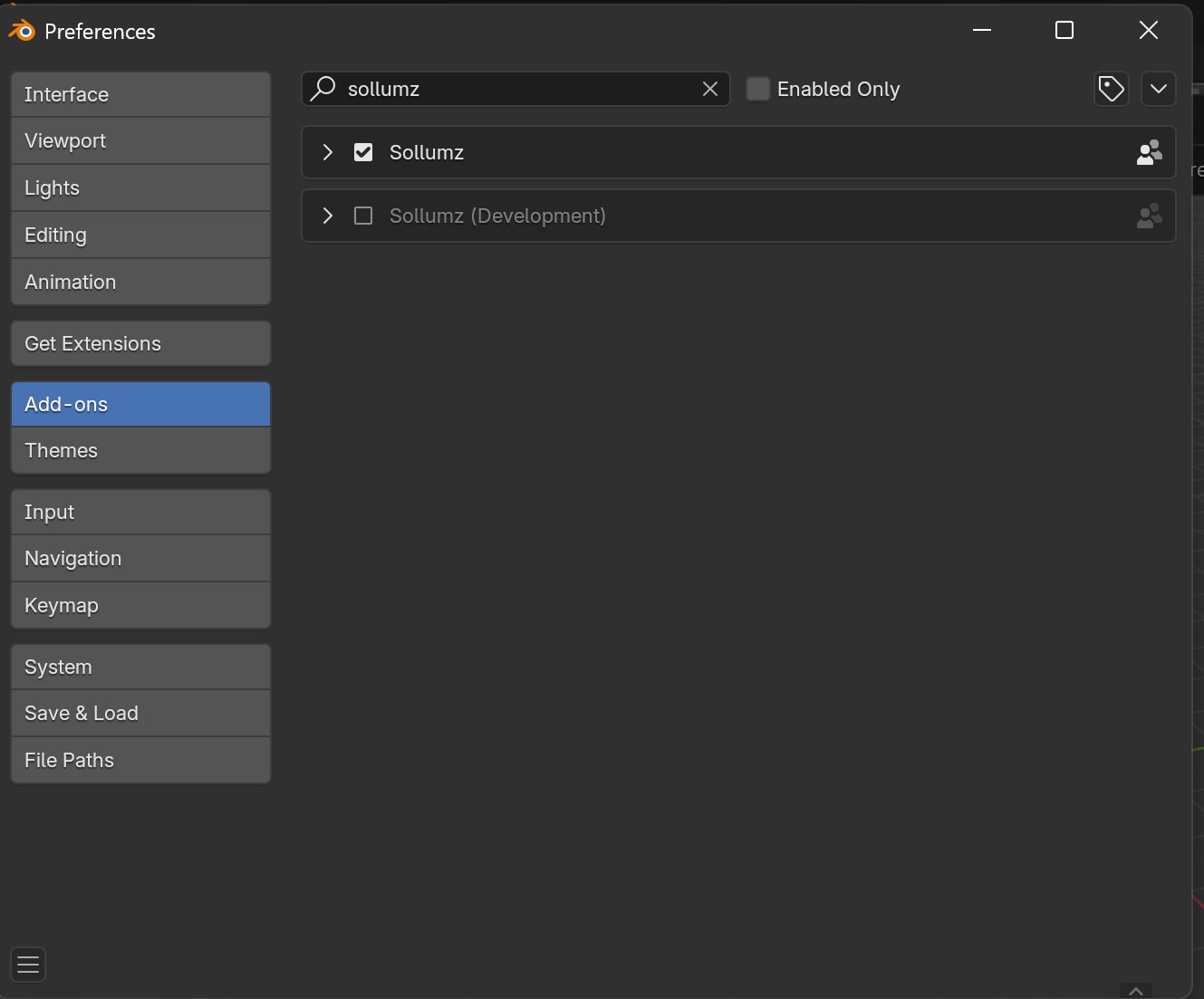 - Cherchez Sollumz dans la barre de recherche et vérifier que l'extension est bien cochée. Si ce n'est pas le cas, cocher la case et redémarrer blender