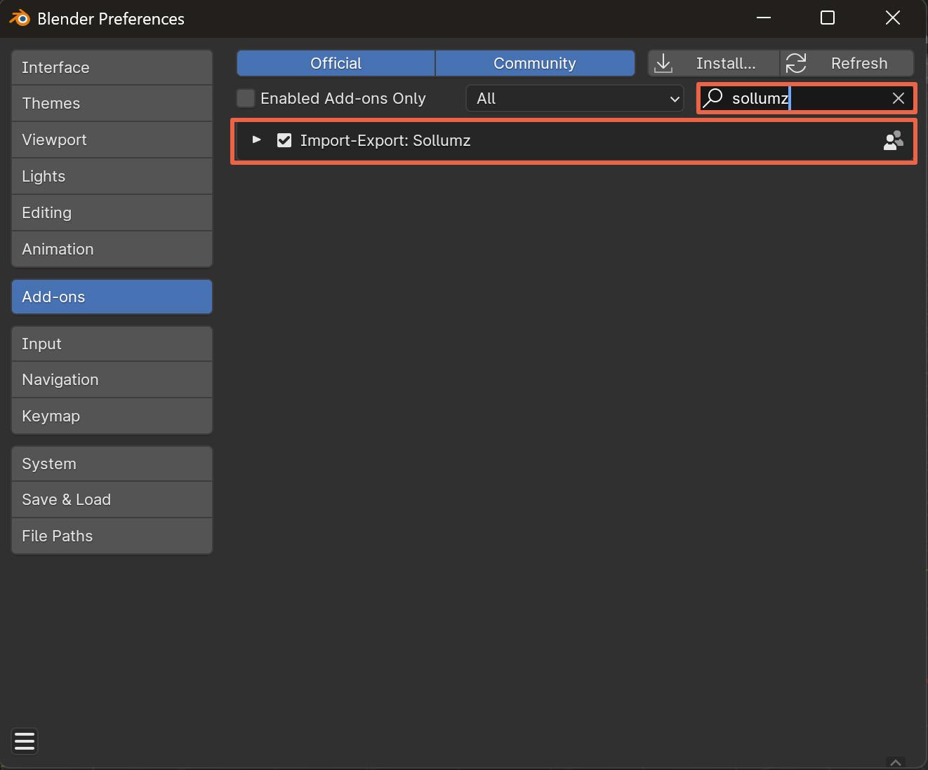 5.Allez dans Add-ons et vérifier que Sollumz soit bien coché.