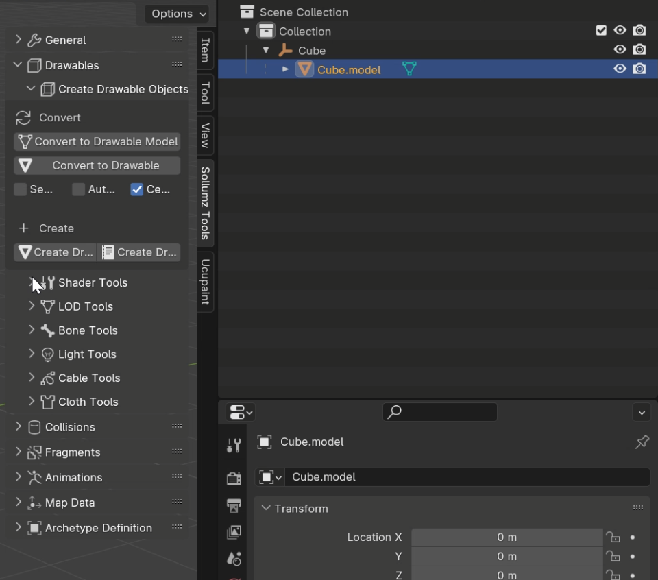 Sollumz Tools, dansdrawables,create drawable objects > convert to drawable model > convert to drawable(cela créer un empty pour votre objet).