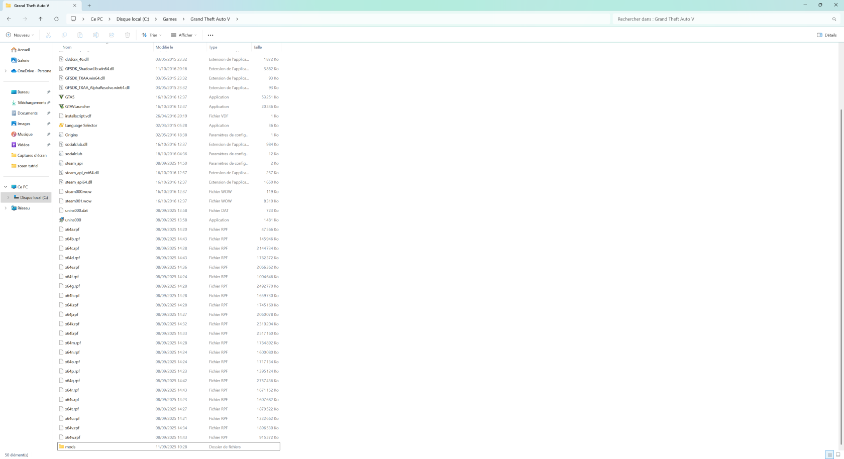 C:/Games/GTAV, créez un nouveau dossier appeléMods. -